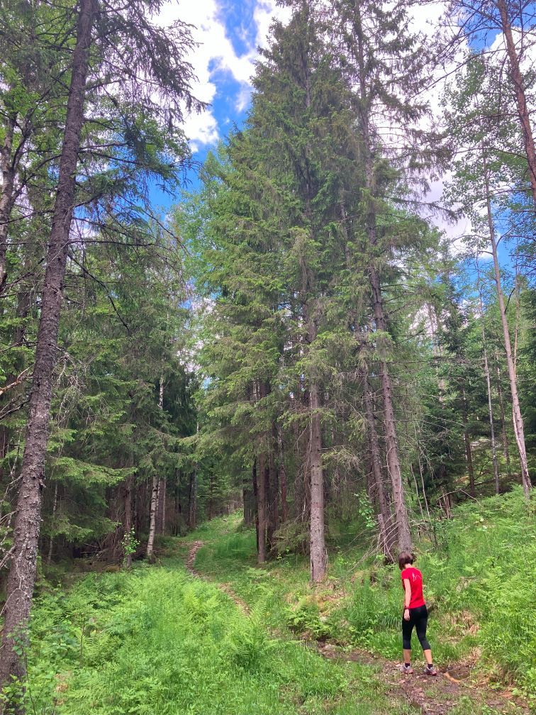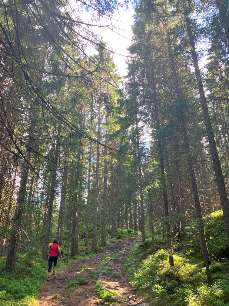Prima parte a traseului ne duce pe partia de ski fond, pe dealuri umbrite, care acum abundă de alergatori si bicicliști. Ne dorim sa ajungem la una din cele mai căutate atracții din toata Nordmarka: podul suspendat Bjørnsjøhelvete.
