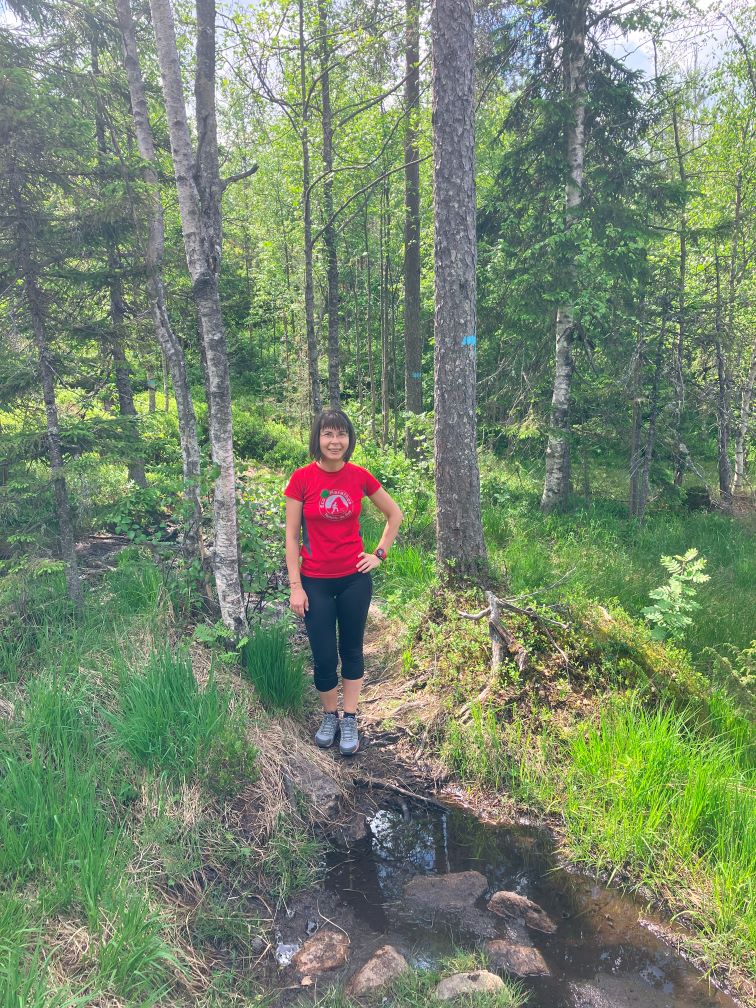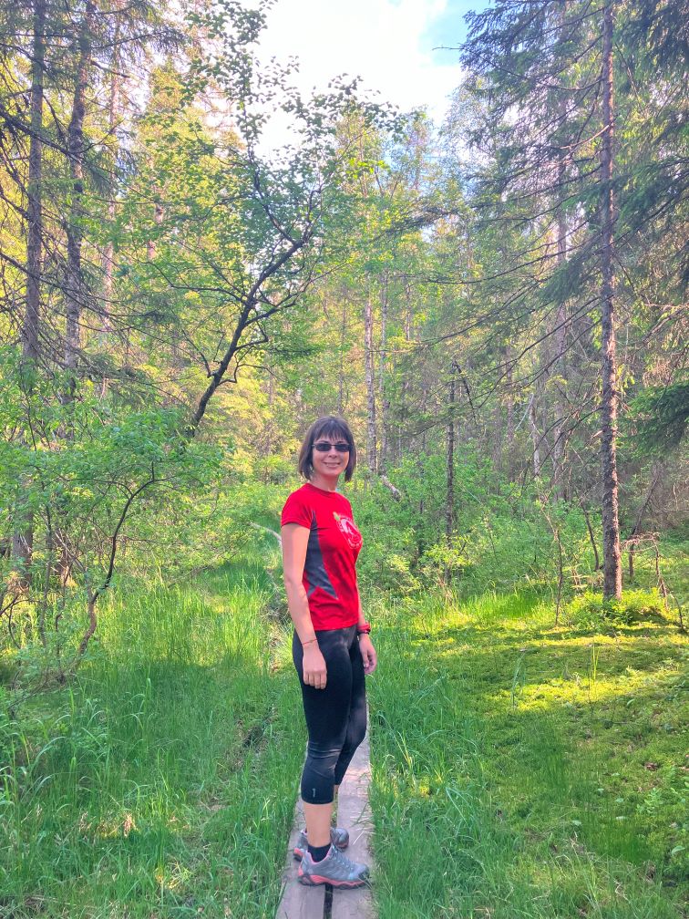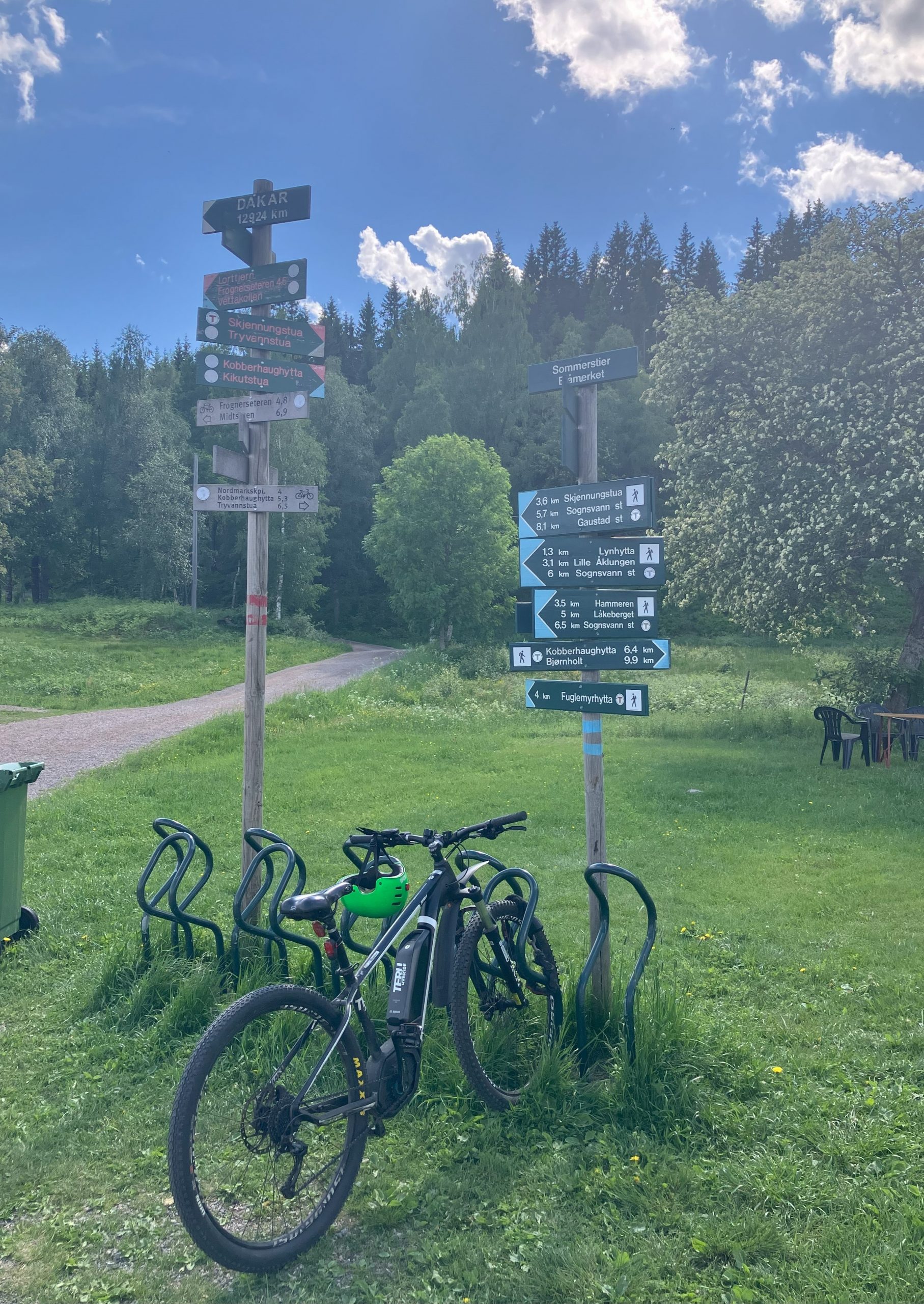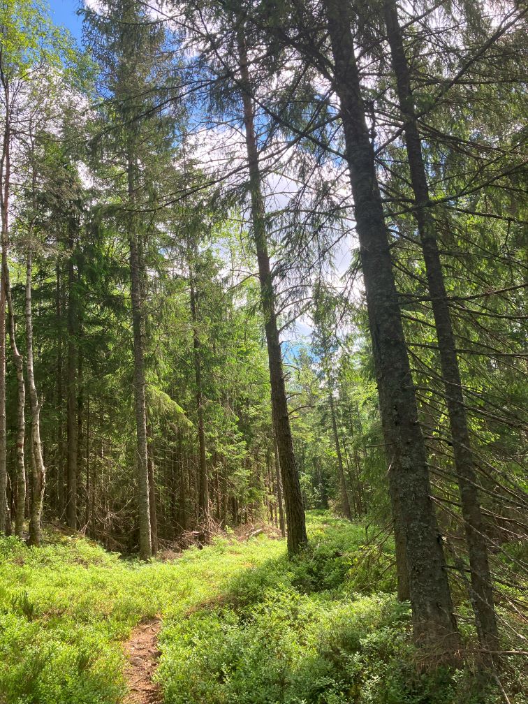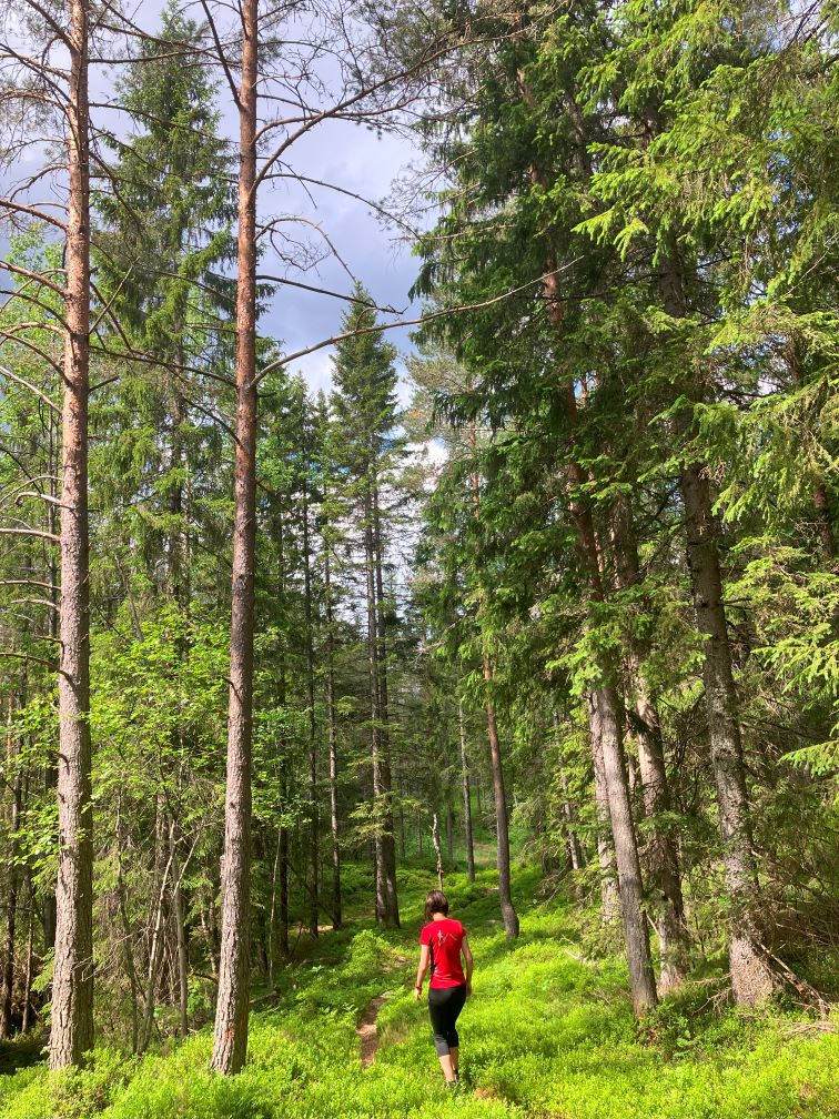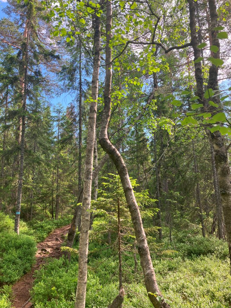 Ne obișnuim cu marcajele de traseu, si realizam ca sunt semne distinctive pentru traseele de hiking: pentru noi va fi reprezentativa o dunga orizontala albastra, intinsa aparent neglijent, pe tulpina copacilor. Aici vom parasi drumul amenajat al biciclistilor, pentru a pasi cu adevarat in Padurea Nordică: vegetatie abundenta, copaci maiestuosi, tundra si pâraie si lacuri, si lespezi late de stanca. Tot peisajul acesta mistic te duce cu gandul catre povesti si legende populare cu elfi si zane si duhuri care traiesc sub pamant.