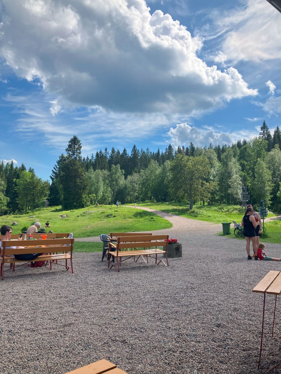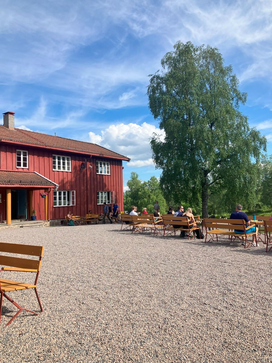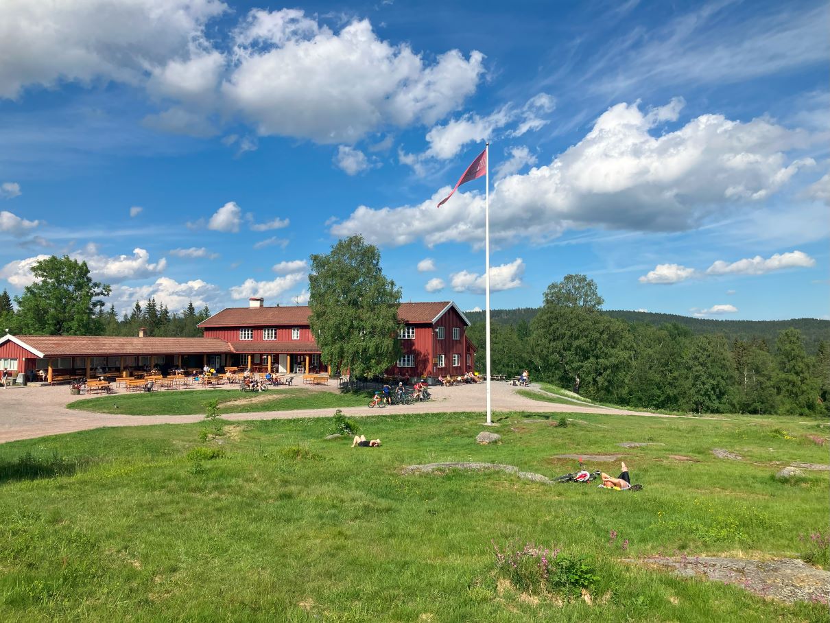 Cand incepeam sa ne ingrijoram legat de proviziile de apa, ajungem in cel mai supra-real moment al drumetiei: din salbaticia padurii, iesim pentru a ne intersecta cu drumul amenajat al biciclistilor si in cativa pasi ni se deschide in fata ochilor o imagine ca un miraj. Este Ullevålseter: o poiana larga, plina de oameni, o cabana cu restaurant si terasa, toaleta publica si sursa de apa potabila (amenajată cu robinet, la liber, ceea ce am apreciat enorm in Norvegia, pentru ca nu a fost nevoie sa cheltuim zeci de euro pentru a ne hidrata adecvat).