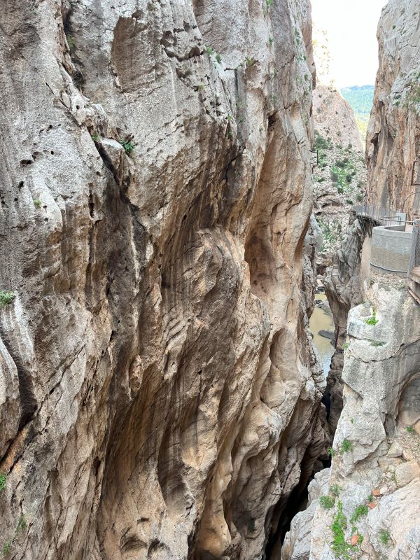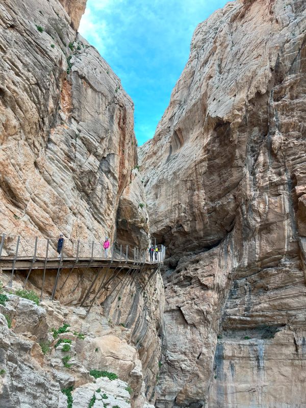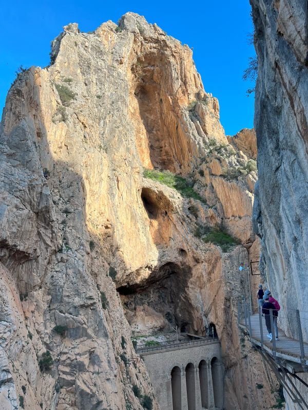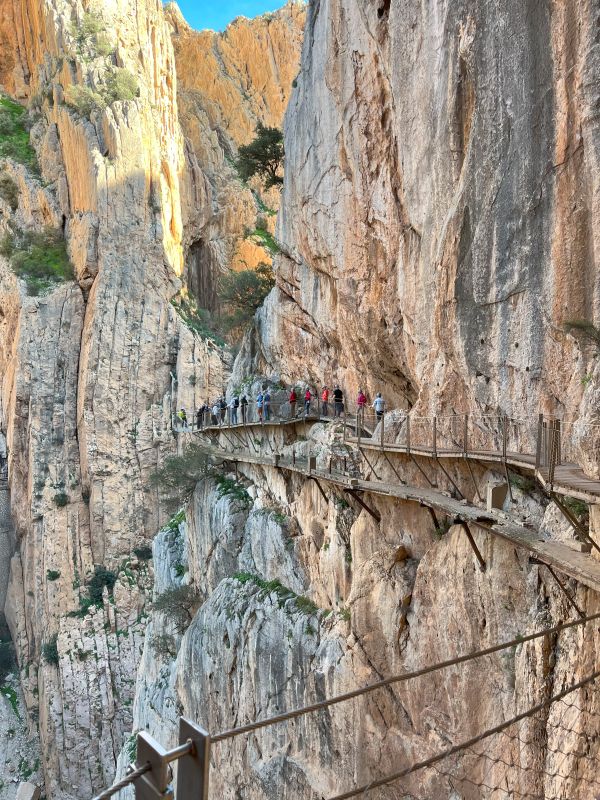 Ghidul ne-a povestit despre istoria traseului, despre cum însuși regele Alfonso al XIII-lea a parcurs această cale de acces în 1921 la inaugurarea barajului din apropiere – de aici și numele regal al potecii. Ne-am oprit să admirăm adâncimea cheilor de sub noi, fețele abrupte ale stâncilor, și chiar am zărit câțiva alpiniști curajoși cățărându-se în apropiere.