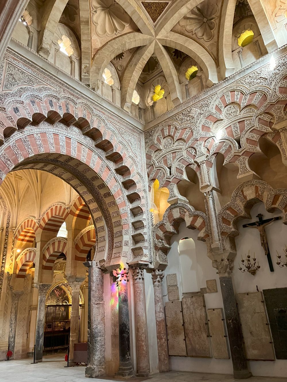 Una dintre caracteristicile definitorii ale moscheii sunt arcadele cu cărămidă alternantă, de culoare roșie și albă, ceea ce oferă un efect vizual spectaculos. În prezent, în jur de 850 de coloane, susțin arcadele duble emblematice. Coloanele sunt realizate din materiale diverse, precum marmura, granitul, jaspul și alabastrul, multe dintre ele fiind refolosite din clădiri romane și vizigote, ceea ce adaugă un caracter eclectic și unic edificiului.