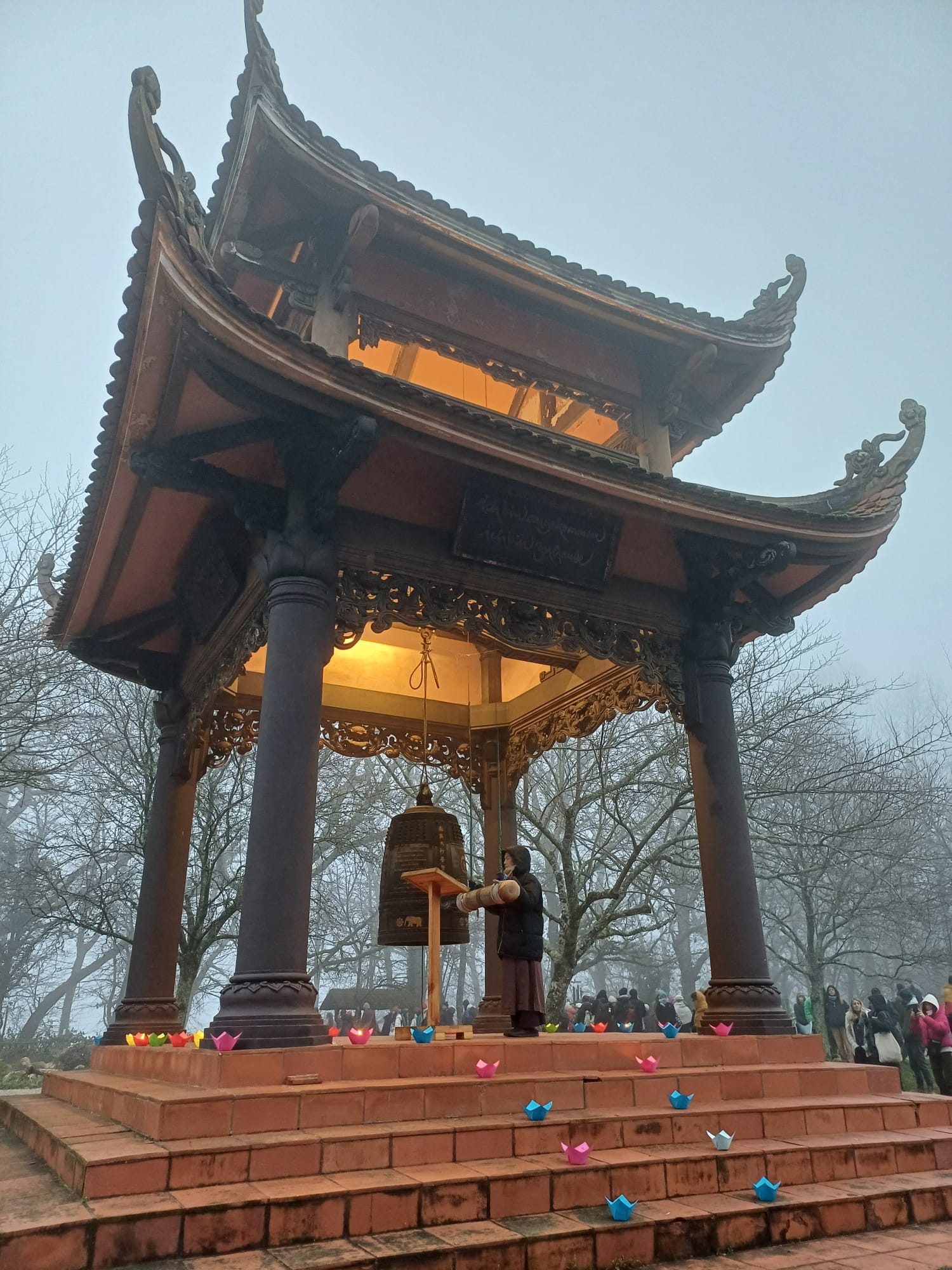 Întuneric. Pășesc la lumina frontalei. Aș vrea să dau impresia că nu mă grăbesc, dacă totuși mă vede careva. Mă îndrept către Grand Meditation Hall. Planul este să ajung câteva minute mai devreme, înainte de meditația ghidată care începe la ora 6:30. Deodată, din tot acest întuneric înghețat, se aude sunetul clar al clopotului. Umple tot spațiul din jur.